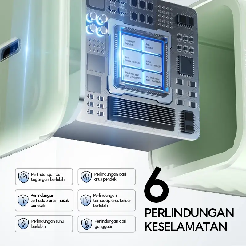 - Memiliki Fitur 6 Safety Protection ( Perlindungan terhadap suhu, tegangan, arus listrik yang berlebih )