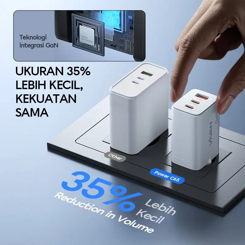 3. Menggunakan teknologi material GaN (Gallium Nitride) - semikonduktor generasi keempat terbaru yang mendukung kinerja charger agar dapat menahan suhu tinggi, lebih kuat serta mampu mengisi daya lebih cepat dan efisien.
