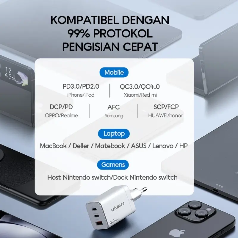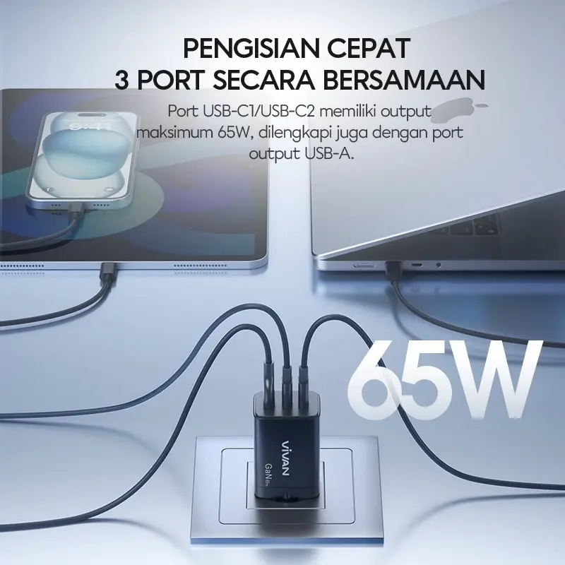 VIVAN Charger Power C65 | GaN 65W Fast Charging PD QC 3.0 | Travel Size 3 Port - Garansi 1 Tahun