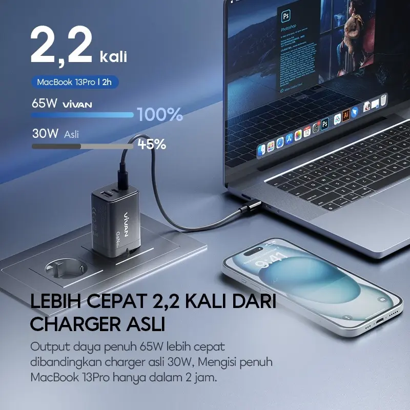 1. Dengan daya tinggi 65W 5A charger ini dapat digunakan untuk mengisi daya Macbook Pro 16 hingga 55% dalam 30 menit.