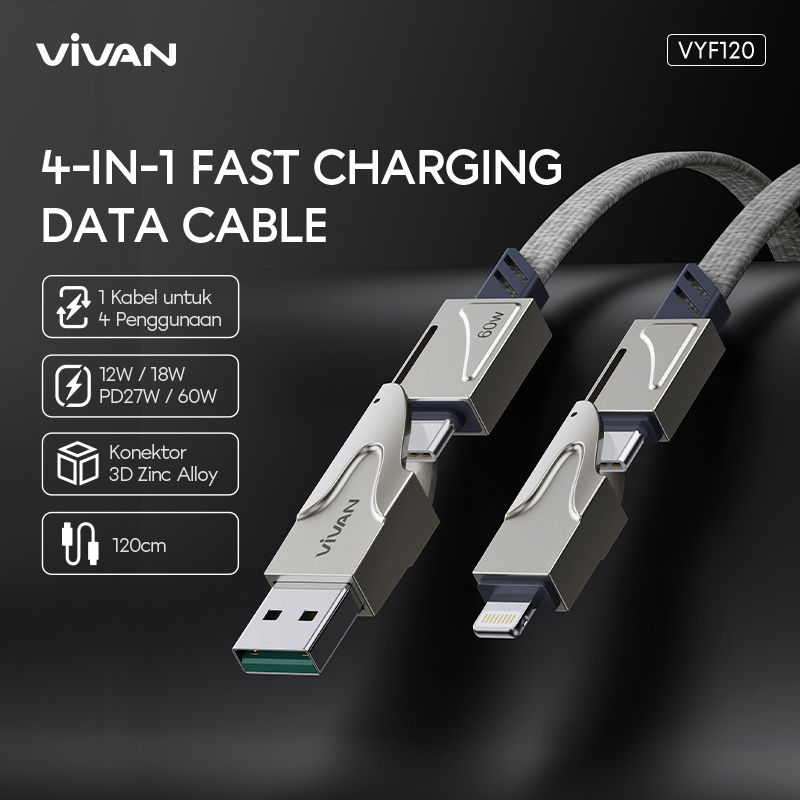 VIVAN VYF120 Kabel Data 4 IN 1 USB A Type C Lightning Cable Fast Charging 6A 60W 120CM - GARANSI RESMI 1 TAHUN